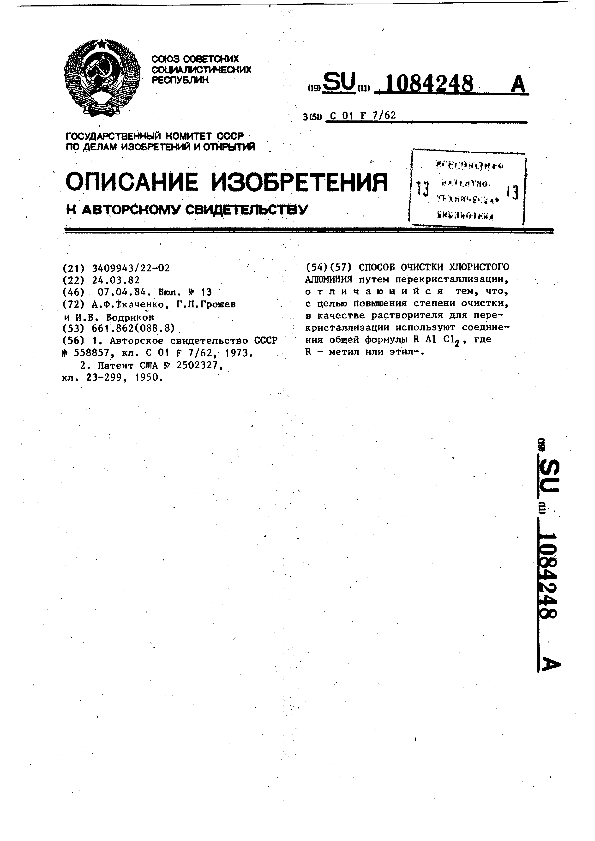 Способ очистки хлористого алюминия / Ткаченко А. Ф., Грошев Г. Л., Бодриков И. В. // Описания изобретений (ретрофонд) / Комитет по патентам и товарным знакам России. – М. — (Патенты России)., 2003. – 1984, № 1. — Загл. с титул. экрана. — Поисковая система: ИПС MIMOSA GTI. — Систем. требования: Acrobat Reader. — Режим доступа: ftp://smolensklib.ru/bd/patent_ru/pt1084248.pdf. — <URL:ftp://smolensklib.ru/bd/patent_ru/pt1084248.pdf>.