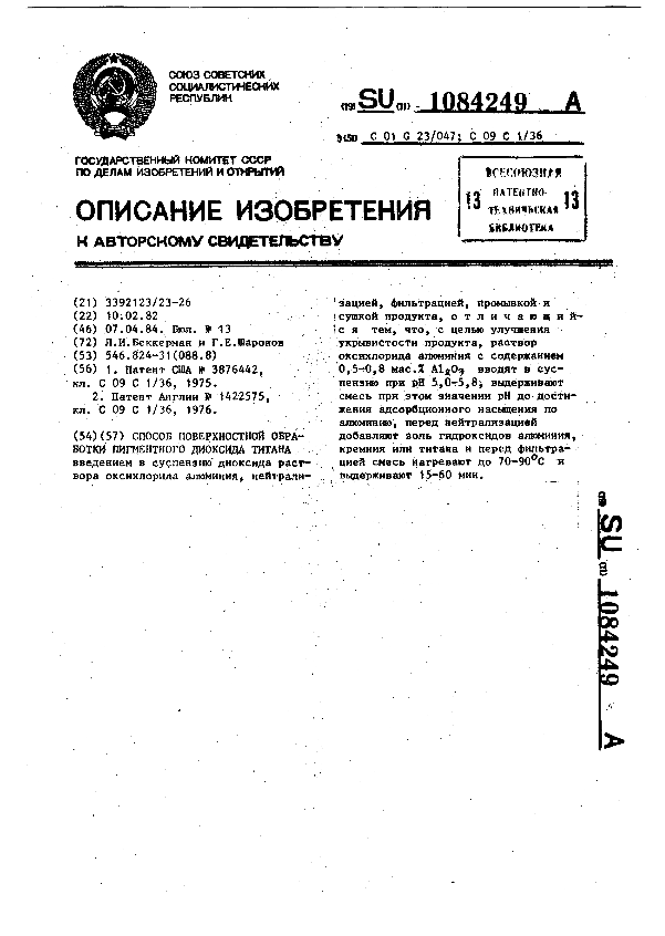 Способ поверхностной обработки пигментного диоксида титана / Беккерман Л. И., Шаронов Г. Е. // Описания изобретений (ретрофонд) / Комитет по патентам и товарным знакам России. – М. — (Патенты России)., 2003. – 1984, № 1. — Загл. с титул. экрана. — Поисковая система: ИПС MIMOSA GTI. — Систем. требования: Acrobat Reader. — Режим доступа: ftp://smolensklib.ru/bd/patent_ru/pt1084249.pdf. — <URL:ftp://smolensklib.ru/bd/patent_ru/pt1084249.pdf>.