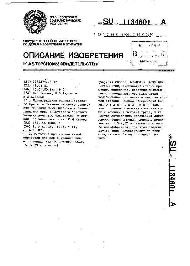 Способ выработки кожи для верха обуви / Е. В. Розова, В. Ф. Андросов, Л. А. Вольф; заявитель: Ленинградский ордена Трудового Красного Знамени институт советской торговли им.Ф.Энгельса и Ленинградский ордена Трудового Красного Знамени институт текстильной и легкой промышленности им. С.М.Кирова // Описания изобретений (ретрофонд) / Комитет по патентам и товарным знакам России. – М., 2003. – 1985, № 1. — (Патенты России). — Загл. с титул. экрана. — Поисковая система: MIMOSA GTI. — Систем. требования: Acrobat Reader. — Режим доступа: ftp://smolensklib.ru/bd/patent_ru/pt1134601.pdf. — <URL:ftp://smolensklib.ru/bd/patent_ru/pt1134601.pdf>.
