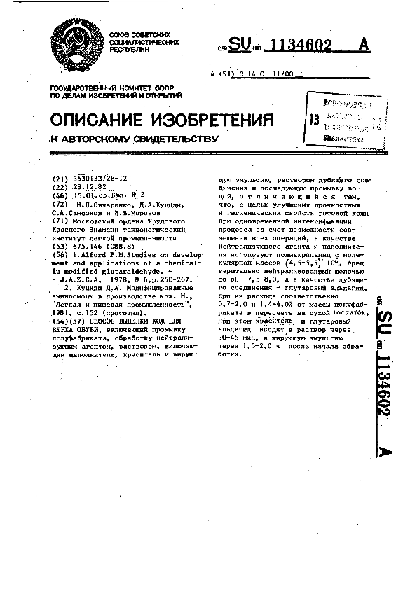 Способ выделки кож для верха обуви / Н. П. Овчаренко, Д. А. Куциди, С. А. Самсонов, В. В. Морозов; заявитель: Московский ордена Трудового Красного Знамени технологический институт легкой промышленности // Описания изобретений (ретрофонд) / Комитет по патентам и товарным знакам России. – М., 2003. – 1985, № 1. — (Патенты России). — Загл. с титул. экрана. — Поисковая система: MIMOSA GTI. — Систем. требования: Acrobat Reader. — Режим доступа: ftp://smolensklib.ru/bd/patent_ru/pt1134602.pdf. — <URL:ftp://smolensklib.ru/bd/patent_ru/pt1134602.pdf>.