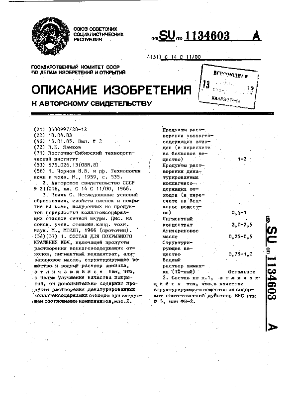 Состав для покрывного крашения кож / В. К. Языков; заявитель: Восточно-Сибирский технологический институт // Описания изобретений (ретрофонд) / Комитет по патентам и товарным знакам России. – М., 2003. – 1985, № 1. — (Патенты России). — Загл. с титул. экрана. — Поисковая система: MIMOSA GTI. — Систем. требования: Acrobat Reader. — Режим доступа: ftp://smolensklib.ru/bd/patent_ru/pt1134603.pdf. — <URL:ftp://smolensklib.ru/bd/patent_ru/pt1134603.pdf>.