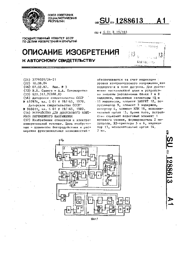 Устройство для допускового контроля переменного напряжения / Сапига Н. Н., Пономаренко А. А. // Описания изобретений (ретрофонд) / Комитет по патентам и товарным знакам России. – М., 2003. – 1987, № 1. — (Патенты России). — Загл. с титул. экрана. — Поисковая система: MIMOSA GTI. — Систем. требования: Acrobat Reader. — Режим доступа: ftp://smolensklib.ru/bd/patent_ru/pt1288613.pdf. — <URL:ftp://smolensklib.ru/bd/patent_ru/pt1288613.pdf>.