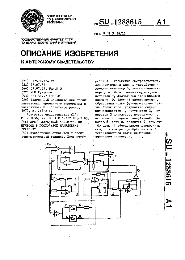 Преобразователь амплитуды импульсов в постоянное напряжение “Галс-В” / Кукушкин М. И. // Описания изобретений (ретрофонд) / Комитет по патентам и товарным знакам России. – М., 2003. – 1987, № 1. — (Патенты России). — Загл. с титул. экрана. — Поисковая система: MIMOSA GTI. — Систем. требования: Acrobat Reader. — Режим доступа: ftp://smolensklib.ru/bd/patent_ru/pt1288615.pdf. — <URL:ftp://smolensklib.ru/bd/patent_ru/pt1288615.pdf>.