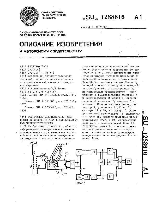 Устройство для измерения мощности переменного тока в высоковольтных электроустановках / Москалев Б. А., Попов В. Б.; заявитель: Всесоюзный научно-исследовательский, проектно-конструкторский и технологический институт электровозостроения // Описания изобретений (ретрофонд) / Комитет по патентам и товарным знакам России. – М., 2003. – 1987, № 1. — (Патенты России). — Загл. с титул. экрана. — Поисковая система: MIMOSA GTI. — Систем. требования: Acrobat Reader. — Режим доступа: ftp://smolensklib.ru/bd/patent_ru/pt1288616.pdf. — <URL:ftp://smolensklib.ru/bd/patent_ru/pt1288616.pdf>.