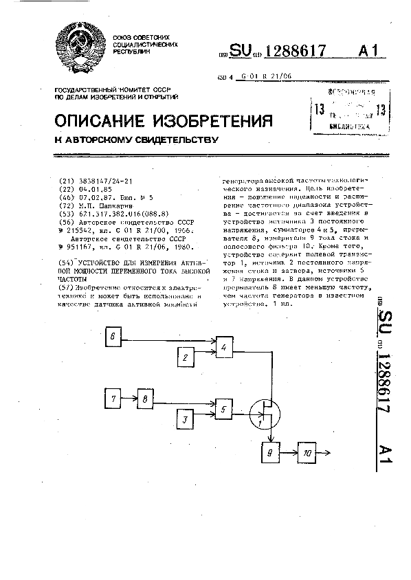 Устройство для измерения активной мощности переменного тока высокой частоты / Шапкарин М. П. // Описания изобретений (ретрофонд) / Комитет по патентам и товарным знакам России. – М., 2003. – 1987, № 1. — (Патенты России). — Загл. с титул. экрана. — Поисковая система: MIMOSA GTI. — Систем. требования: Acrobat Reader. — Режим доступа: ftp://smolensklib.ru/bd/patent_ru/pt1288617.pdf. — <URL:ftp://smolensklib.ru/bd/patent_ru/pt1288617.pdf>.