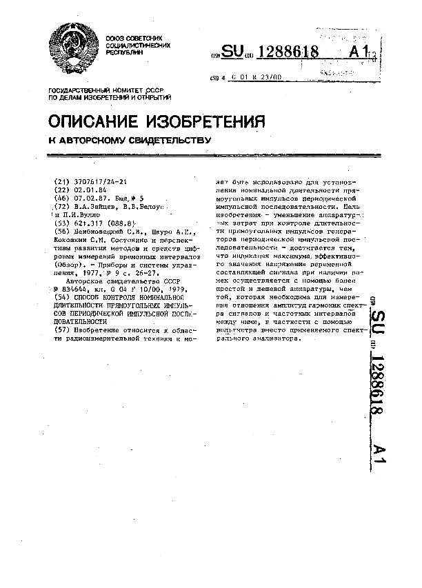 Способ контроля номинальной длительности прямоугольных импульсов периодической импульсной последовательности / Зайцев В. А., Белоус В. В., Вулло Л. И. // Описания изобретений (ретрофонд) / Комитет по патентам и товарным знакам России. – М., 2003. – 1987, № 1. — (Патенты России). — Загл. с титул. экрана. — Поисковая система: MIMOSA GTI. — Систем. требования: Acrobat Reader. — Режим доступа: ftp://smolensklib.ru/bd/patent_ru/pt1288618.pdf. — <URL:ftp://smolensklib.ru/bd/patent_ru/pt1288618.pdf>.