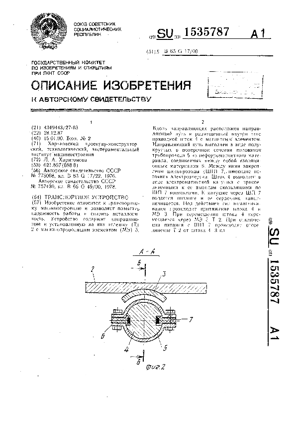 Транспортное устройство / Харитонова Л. А.; заявитель: Харьковский технологический проектно-конструкторский, технологический, экспериментальный институт машиностроения // Описания изобретений (ретрофонд) / Комитет по патентам и товарным знакам России. – М., 2003. – 1990, 1. — (Патенты России). — Загл. с титул. экрана. — Поисковая система: MIMOSA GTI. — Систем. требования: Acrobat Reader. — Режим доступа: ftp://smolensklib.ru/bd/patent_ru/pt1535787.pdf. — <URL:ftp://smolensklib.ru/bd/patent_ru/pt1535787.pdf>.
