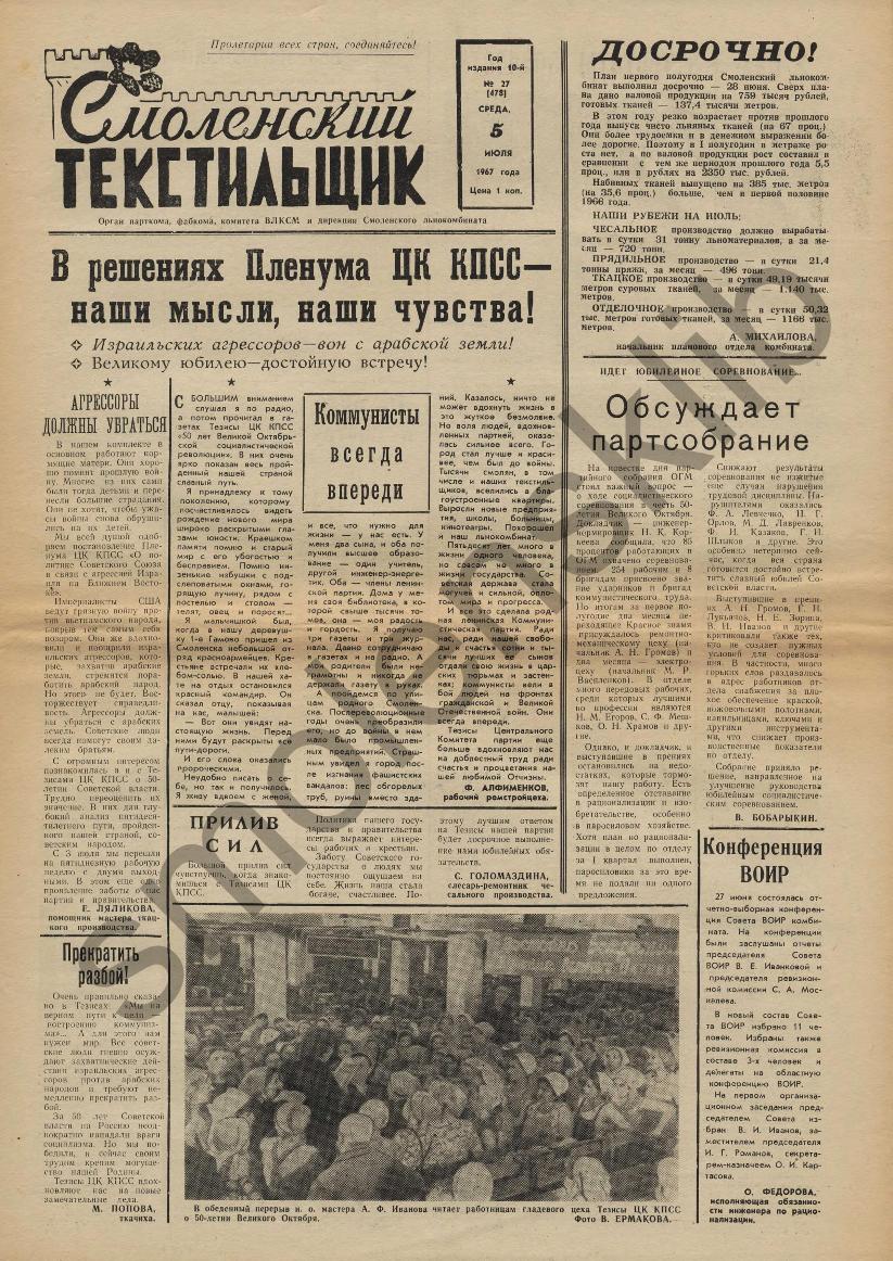 Смоленский текстильщик: Орган парткома, фабкома, комитета ВЛКСМ и дирекции Смоленского льнокомбината. — Смоленск: Тип. им. Смирнова, 1957-____. № 27.