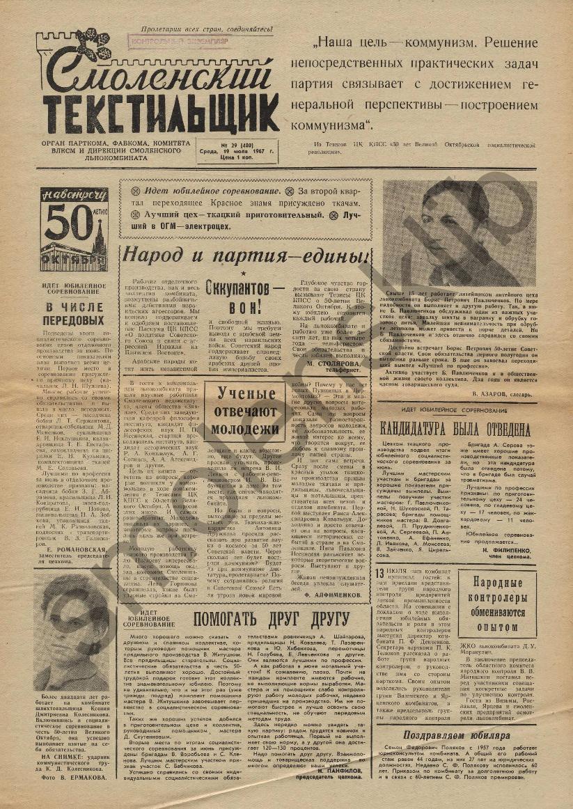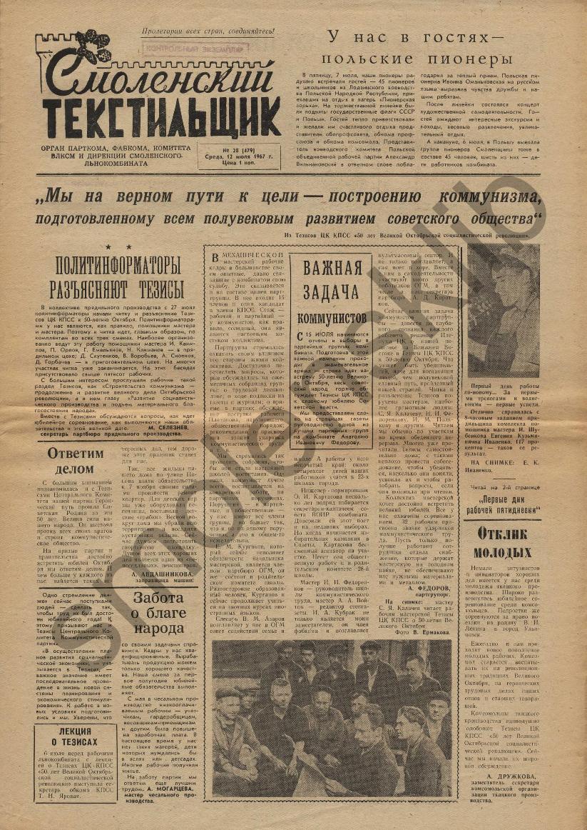 Смоленский текстильщик: Орган парткома, фабкома, комитета ВЛКСМ и дирекции Смоленского льнокомбината. — Смоленск: Тип. им. Смирнова, 1957-____. № 29.