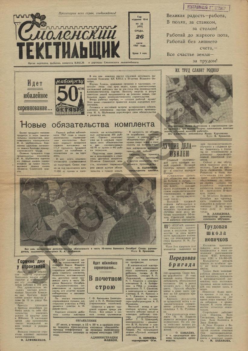 Смоленский текстильщик: Орган парткома, фабкома, комитета ВЛКСМ и дирекции Смоленского льнокомбината. — Смоленск: Тип. им. Смирнова, 1957-____. № 30.