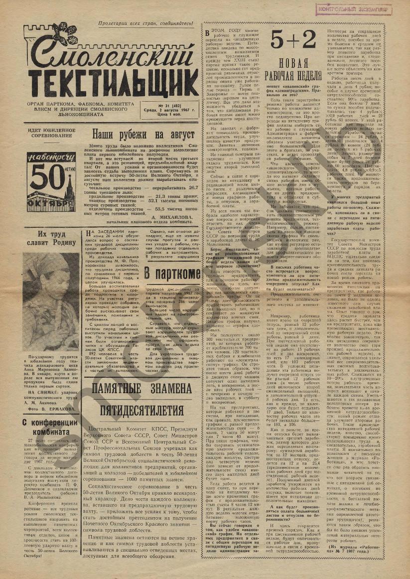Смоленский текстильщик: Орган парткома, фабкома, комитета ВЛКСМ и дирекции Смоленского льнокомбината. — Смоленск: Тип. им. Смирнова, 1957-____. № 31.