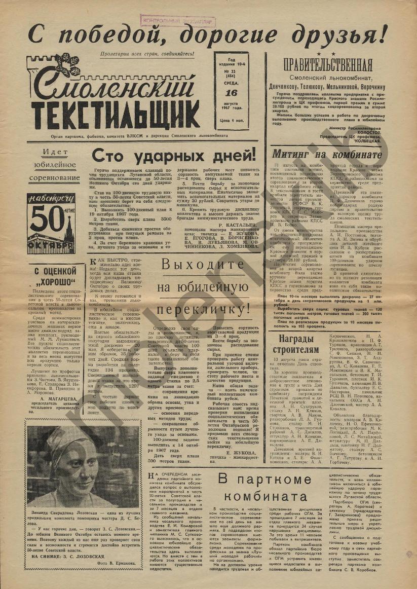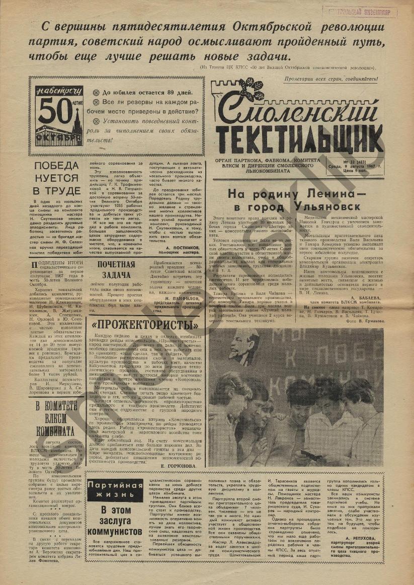 Смоленский текстильщик: Орган парткома, фабкома, комитета ВЛКСМ и дирекции Смоленского льнокомбината. — Смоленск: Тип. им. Смирнова, 1957-____. № 33.