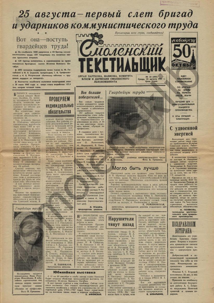 Смоленский текстильщик: Орган парткома, фабкома, комитета ВЛКСМ и дирекции Смоленского льнокомбината. — Смоленск: Тип. им. Смирнова, 1957-____. № 34.