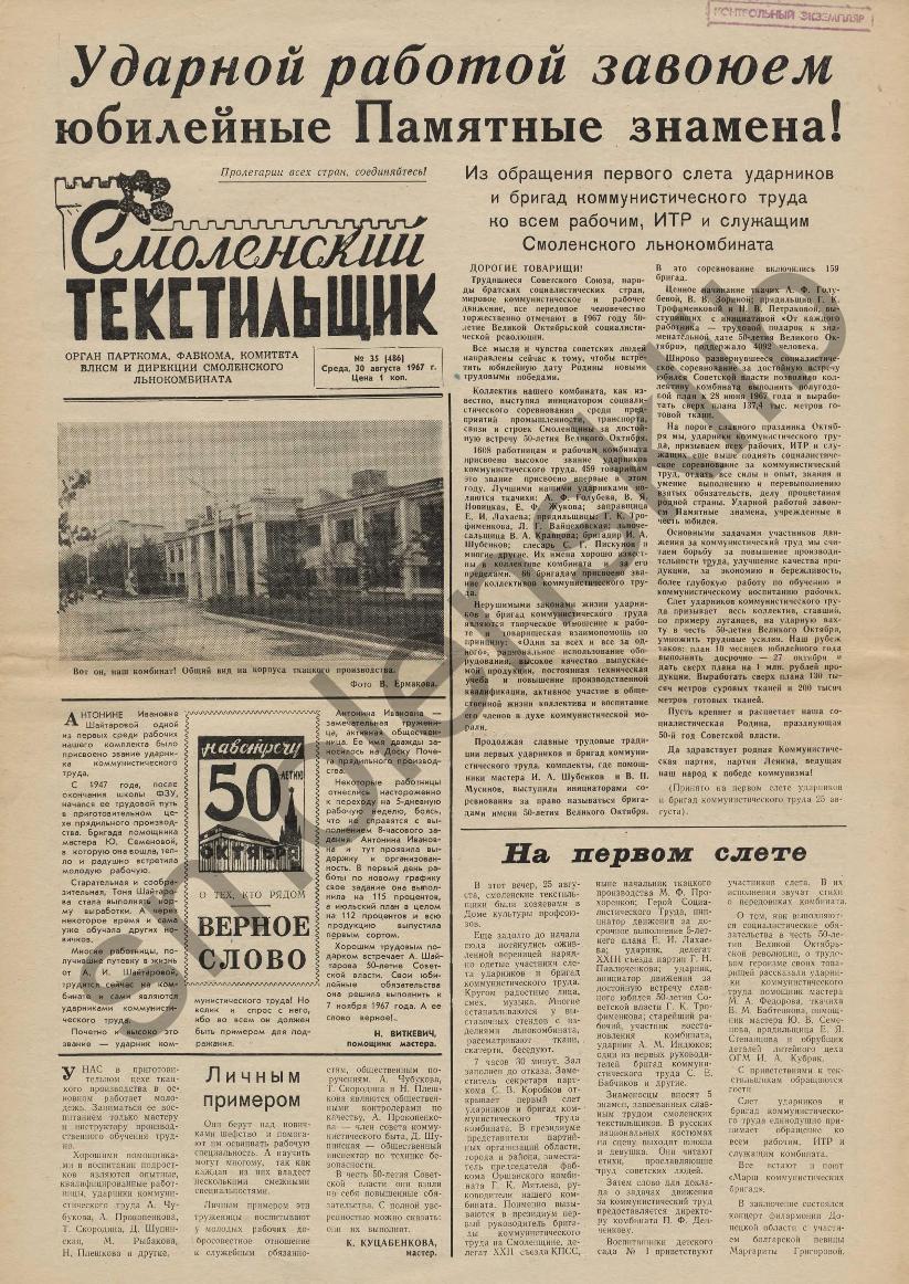 Смоленский текстильщик: Орган парткома, фабкома, комитета ВЛКСМ и дирекции Смоленского льнокомбината. — Смоленск: Тип. им. Смирнова, 1957-____. № 35.