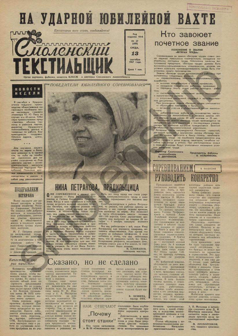 Смоленский текстильщик: Орган парткома, фабкома, комитета ВЛКСМ и дирекции Смоленского льнокомбината. — Смоленск: Тип. им. Смирнова, 1957-____. № 37.