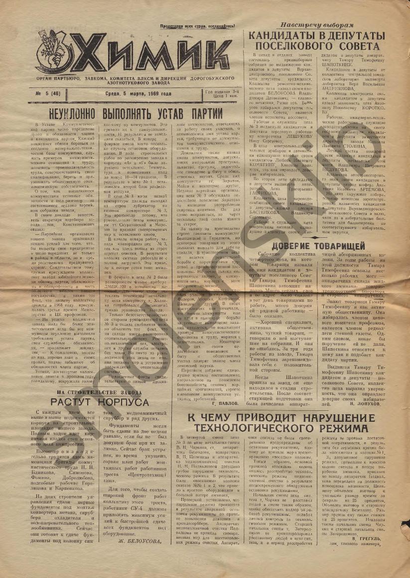 Химик: Орган партбюро, завкома, комитета ВЛКСМ и дирекции Дорогобужского азотнотукового завода. — Дорогобуж: Дорогобужская тип., 1967-____. № 5.