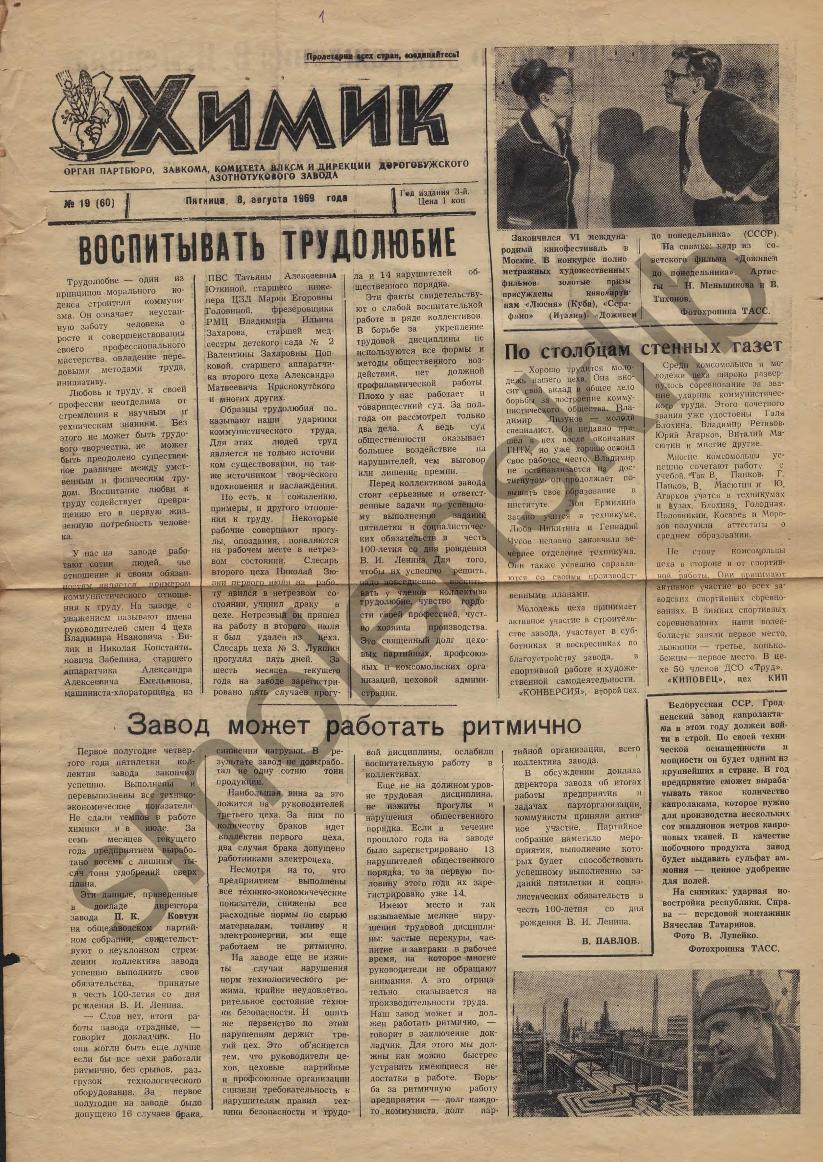 Химик: Орган партбюро, завкома, комитета ВЛКСМ и дирекции Дорогобужского азотнотукового завода. — Дорогобуж: Дорогобужская тип., 1967-____. № 19.