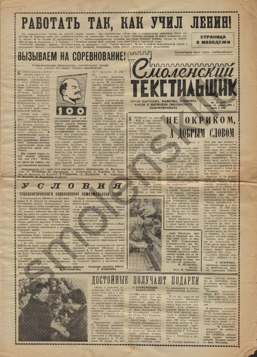Смоленский текстильщик: Орган парткома, фабкома, комитета ВЛКСМ и дирекции Смоленского льнокомбината. — Смоленск: Тип. им. Смирнова, 1957-____. № 13.