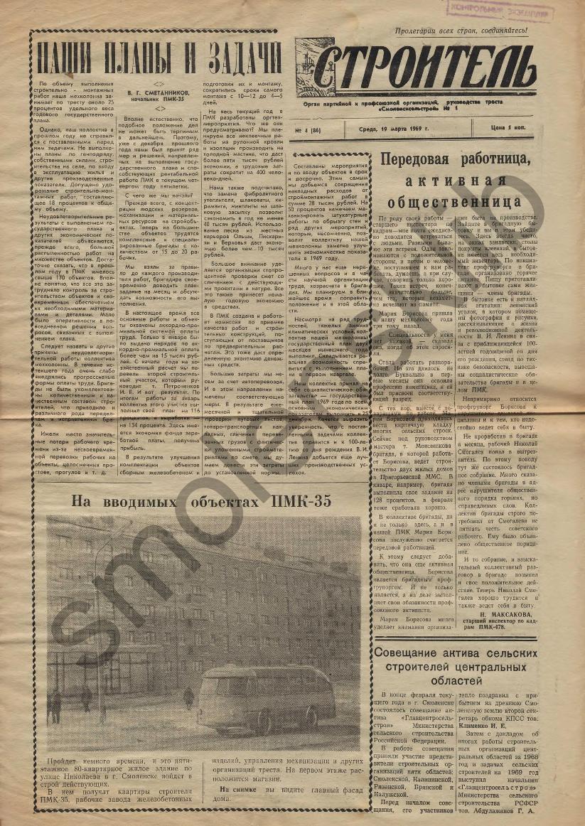 Строитель: Орган партийной и профсоюзной организаций, руководства треста "Смоленсксельстрой" № 1. — Смоленск: Тип. им. Смирнова, 1965-____. № 4.