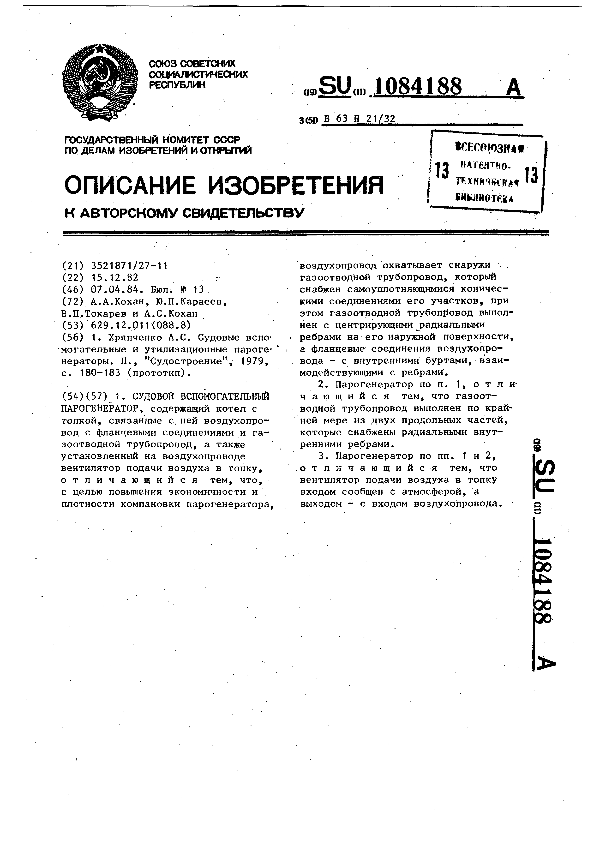 Судовой вспомогательный парогенератор / Кохан А. А., Карасев Ю. П., Токарев В. П., Кохан А. С. // Описания изобретений (ретрофонд) / Комитет по патентам и товарным знакам России. – М. — (Патенты России)., 2003. – 1984, № 1. — Загл. с титул. экрана. — Поисковая система: ИПС MIMOSA GTI. — Систем. требования: Acrobat Reader. — Режим доступа: ftp://smolensklib.ru/bd/patent_ru/pt1084188.pdf. — <URL:ftp://smolensklib.ru/bd/patent_ru/pt1084188.pdf>.