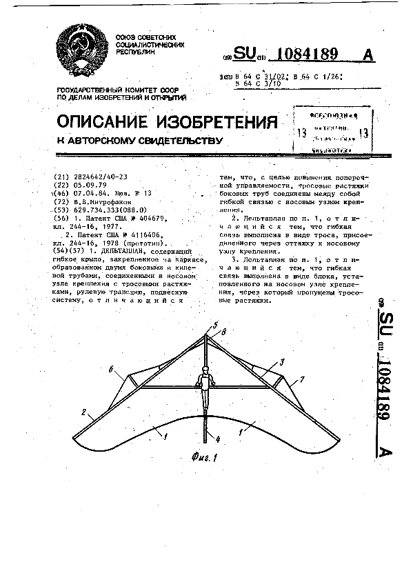 Дельтаплан / Митрофанов В. В. // Описания изобретений (ретрофонд) / Комитет по патентам и товарным знакам России. – М. — (Патенты России)., 2003. – 1984, № 1. — Загл. с титул. экрана. — Поисковая система: ИПС MIMOSA GTI. — Систем. требования: Acrobat Reader. — Режим доступа: ftp://smolensklib.ru/bd/patent_ru/pt1084189.pdf. — <URL:ftp://smolensklib.ru/bd/patent_ru/pt1084189.pdf>.