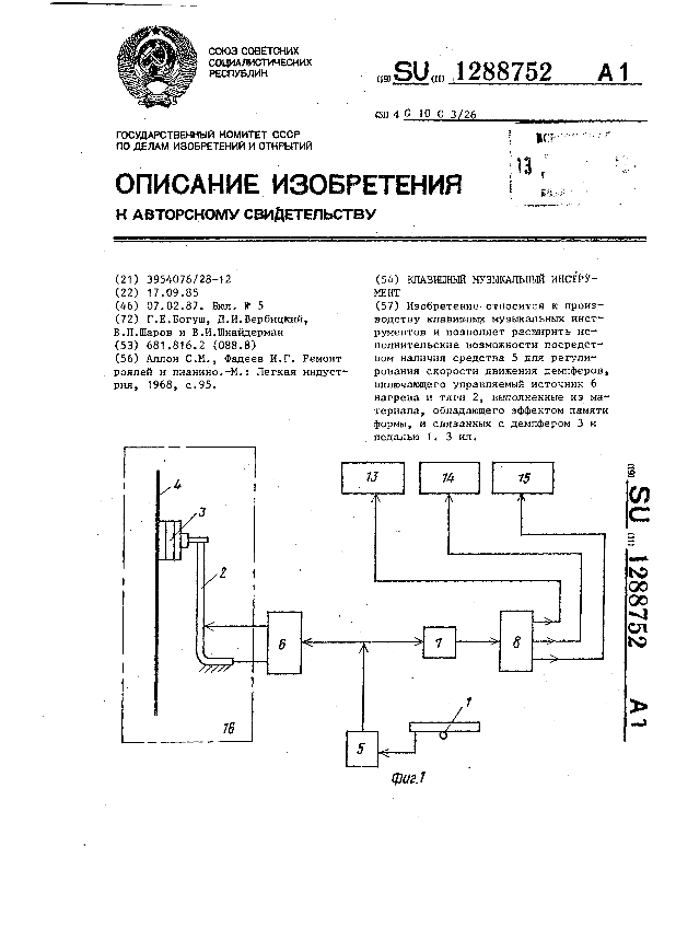 Клавишный музыкальный инструмент / Богуш Г. Е., Вербицкий Д. И., Шаров В. П., Шнайдерман В. И. // Описания изобретений (ретрофонд) / Комитет по патентам и товарным знакам России. – М., 2003. – 1987, № 1. — (Патенты России). — Загл. с титул. экрана. — Систем. требования: Acrobat Reader. — Режим доступа: ftp://smolensklib.ru/bd/patent_ru/pt1288752.pdf. — <URL:ftp://smolensklib.ru/bd/patent_ru/pt1288752.pdf>.