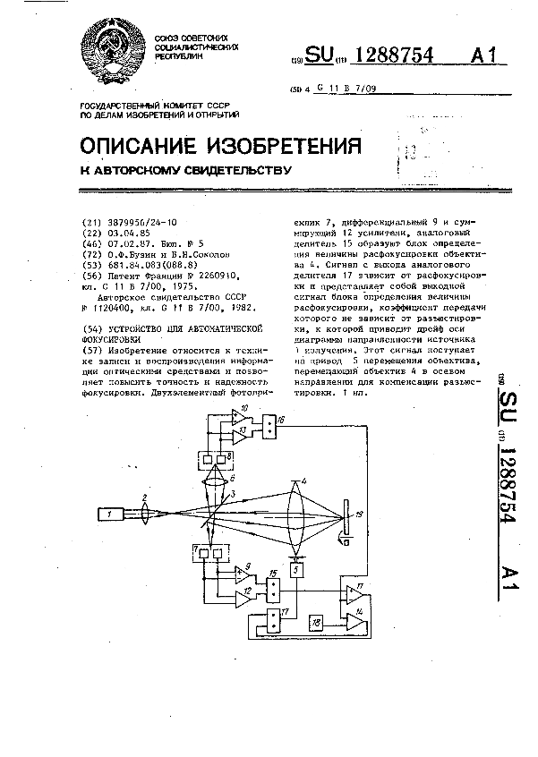 Устройство для автоматической фокусировки / Бузин О. Ф., Соколов В. Н. // Описания изобретений (ретрофонд) / Комитет по патентам и товарным знакам России. – М., 2003. – 1987, № 1. — (Патенты России). — Загл. с титул. экрана. — Систем. требования: Acrobat Reader. — Режим доступа: ftp://smolensklib.ru/bd/patent_ru/pt1288754.pdf. — <URL:ftp://smolensklib.ru/bd/patent_ru/pt1288754.pdf>.