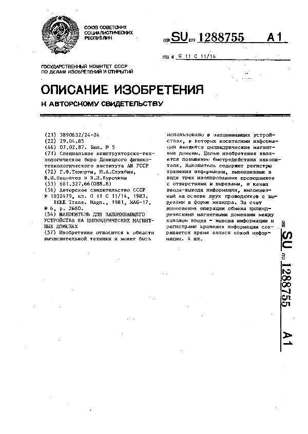 Накопитель для запоминающего устройства на цилиндрических магнитных доменах / Темерти Г. Ф., Службин Ю. А., Нецветов В. И., Курочкин В. И.; заявитель: Специальное конструкторско-технологическое бюро Донецкого физико-технологического института АН УССР // Описания изобретений (ретрофонд) / Комитет по патентам и товарным знакам России. – М., 2003. – 1987, № 1. — (Патенты России). — Загл. с титул. экрана. — Систем. требования: Acrobat Reader. — Режим доступа: ftp://smolensklib.ru/bd/patent_ru/pt1288755.pdf. — <URL:ftp://smolensklib.ru/bd/patent_ru/pt1288755.pdf>.