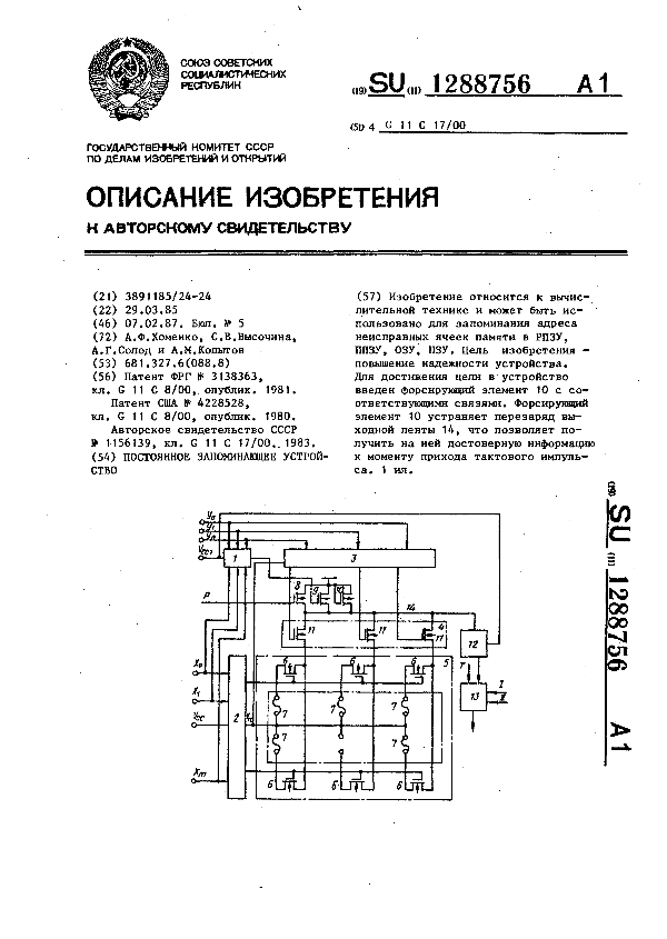Постоянное запоминающее устройство / Хоменко А. Ф., Высочина С. В., Солод А. Г., Копытов А. М. // Описания изобретений (ретрофонд) / Комитет по патентам и товарным знакам России. – М., 2003. – 1987, № 1. — (Патенты России). — Загл. с титул. экрана. — Систем. требования: Acrobat Reader. — Режим доступа: ftp://smolensklib.ru/bd/patent_ru/pt1288756.pdf. — <URL:ftp://smolensklib.ru/bd/patent_ru/pt1288756.pdf>.