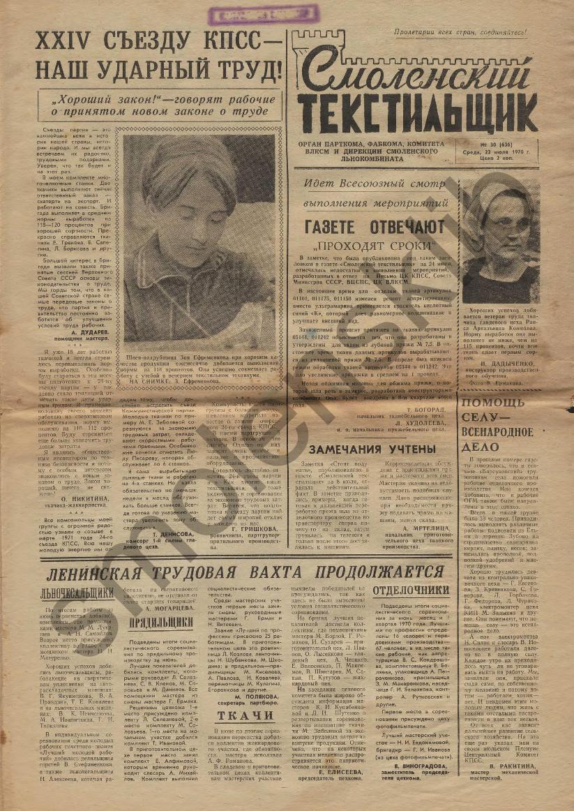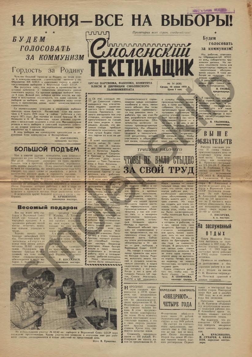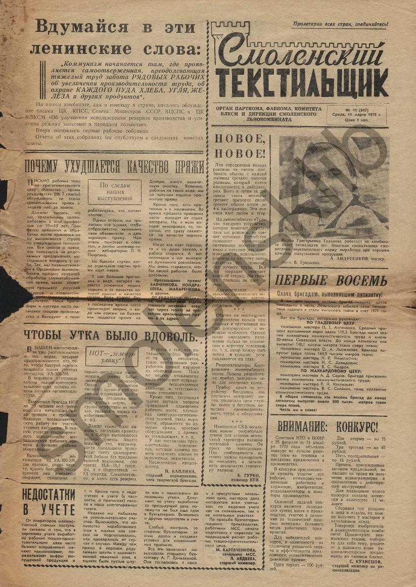 Смоленский текстильщик: Орган парткома, фабкома, комитета ВЛКСМ и дирекции Смоленского льнокомбината. — Смоленск: Тип. им. Смирнова, 1957-____. № 30.