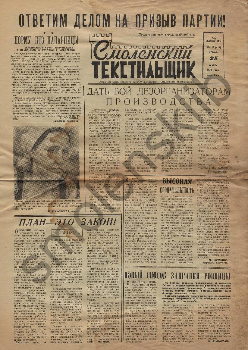 Смоленский текстильщик: Орган парткома, фабкома, комитета ВЛКСМ и дирекции Смоленского льнокомбината. — Смоленск: Тип. им. Смирнова, 1957-____. № 13.