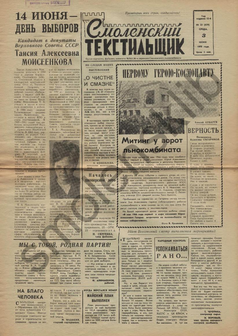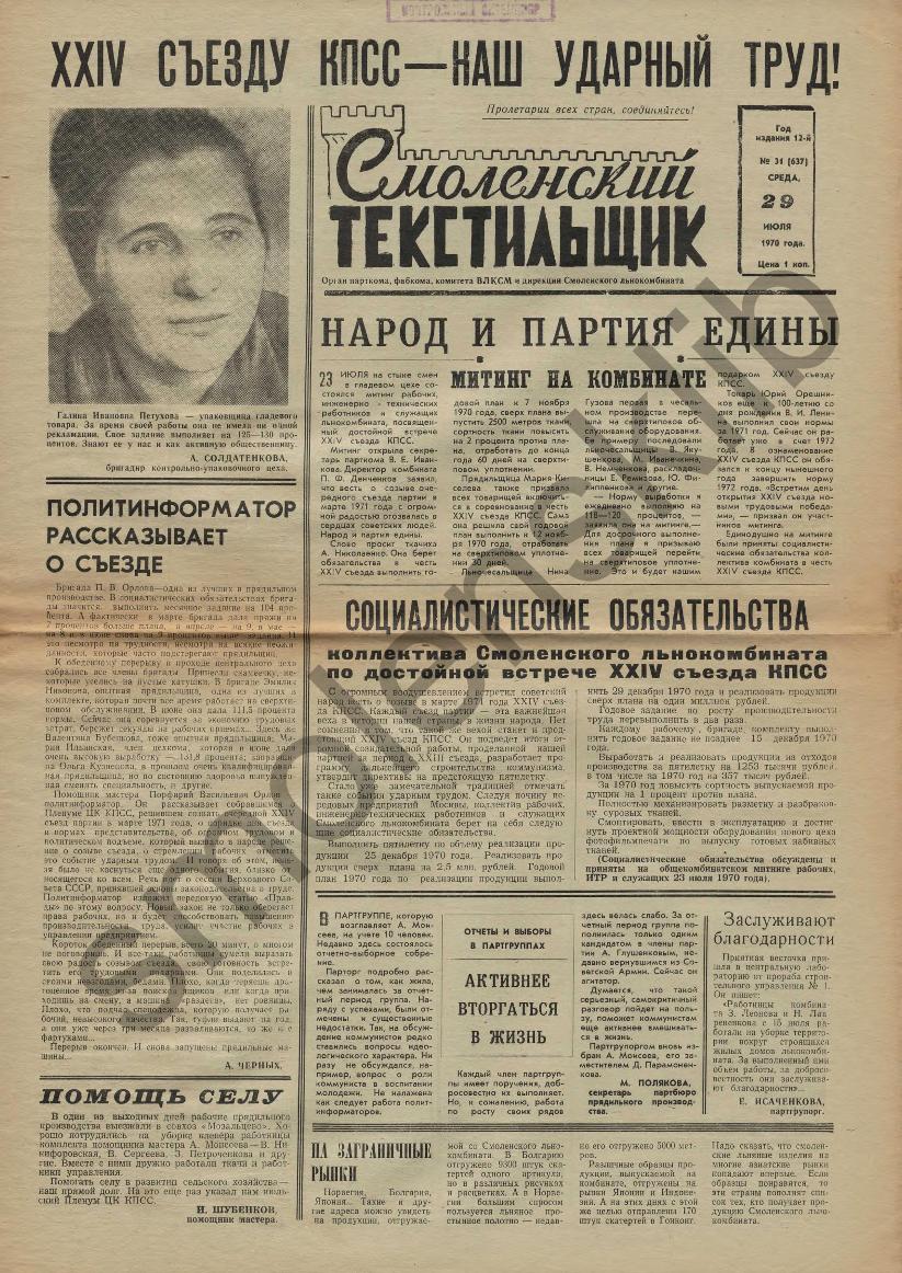 Смоленский текстильщик: Орган парткома, фабкома, комитета ВЛКСМ и дирекции Смоленского льнокомбината. — Смоленск: Тип. им. Смирнова, 1957-____. № 29.