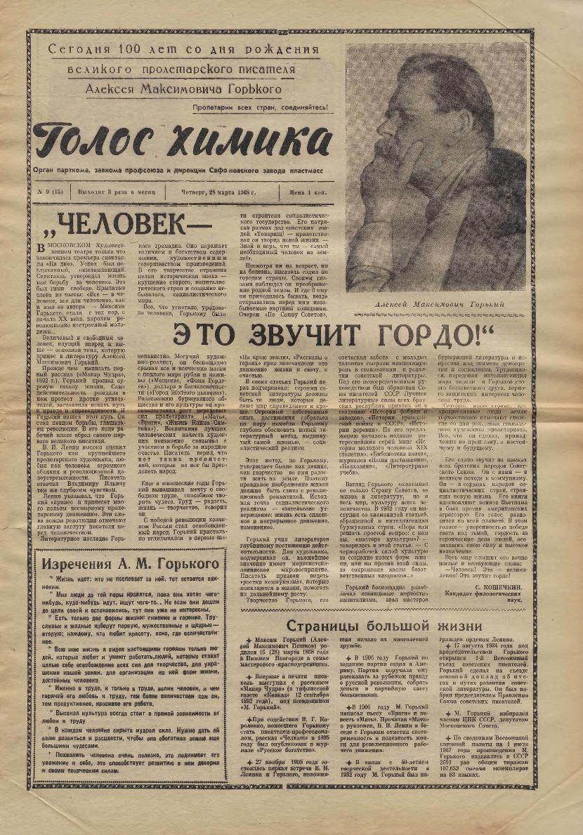Голос химика: Орган парткома, завкома профсоюза и дирекции Сафоновского завода пластмасс. — Сафоново: Сафонов. тип. Смолоблуправ., 1966-____. № 9.