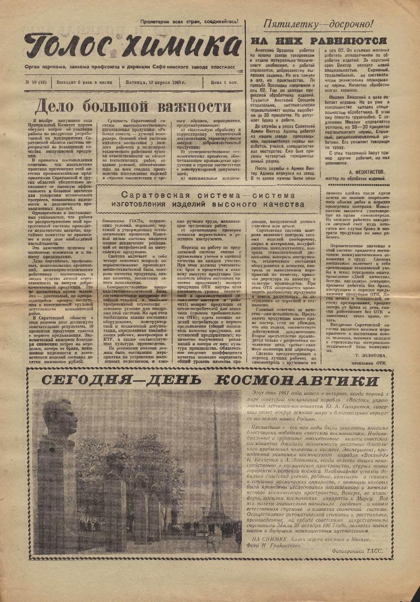 Голос химика: Орган парткома, завкома профсоюза и дирекции Сафоновского завода пластмасс. — Сафоново: Сафонов. тип. Смолоблуправ., 1966-____. № 10.