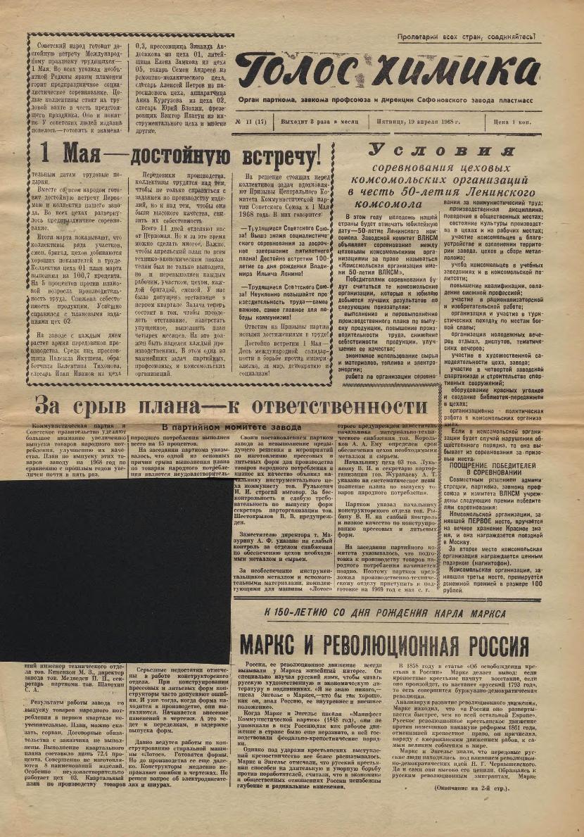 Голос химика: Орган парткома, завкома профсоюза и дирекции Сафоновского завода пластмасс. — Сафоново: Сафонов. тип. Смолоблуправ., 1966-____. № 11.