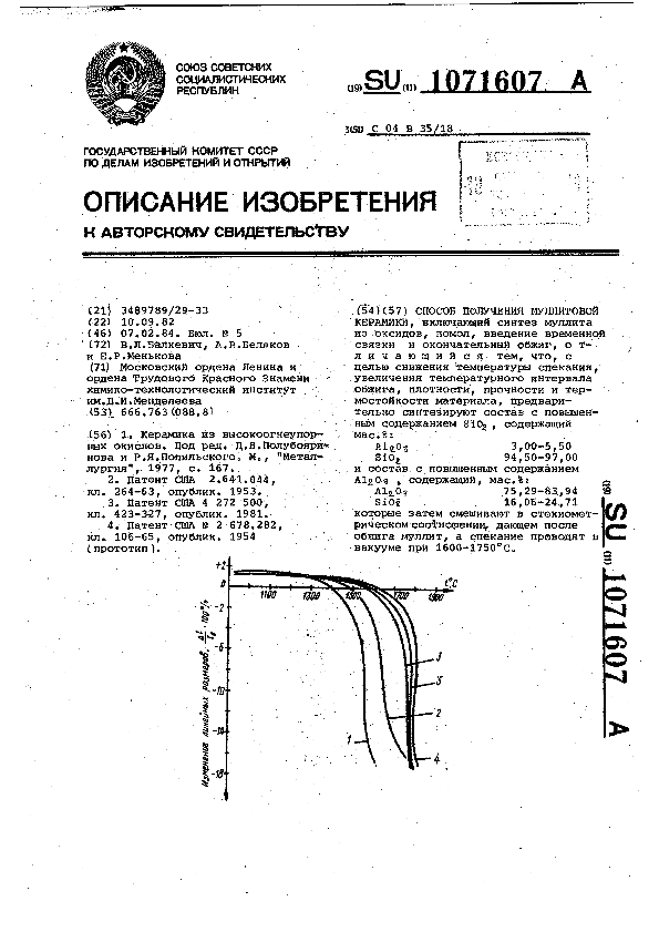 Способ получения муллитовой керамики / Балкевич В. Л., Беляков А. В., Менькова Е. Р.; заявитель: Московский ордена Ленина и ордена Трудового Красного Знамени химико-технологический институт им. Д. И. Менделеева // Описания изобретений (ретрофонд) / Комитет по патентам и товарным знакам России. – М. — (Патенты России)., 2003. – 1984, № 1. — Загл. с титул. экрана. — Поисковая система: ИПС MIMOSA GTI. — Систем. требования: Acrobat Reader. — Режим доступа: ftp://smolensklib.ru/bd/patent_ru/pt1071607.pdf. — <URL:ftp://smolensklib.ru/bd/patent_ru/pt1071607.pdf>.