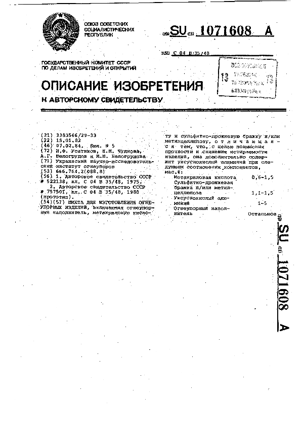 Шихта для изготовления огнеупорных изделий / Усатиков И. Ф., Чуднова Н. М., Белогрудов А. Г., Велогрудова М. М.; заявитель: Украинский научно-исследовательский институт огнеупоров // Описания изобретений (ретрофонд) / Комитет по патентам и товарным знакам России. – М. — (Патенты России)., 2003. – 1984, № 1. — Загл. с титул. экрана. — Поисковая система: ИПС MIMOSA GTI. — Систем. требования: Acrobat Reader. — Режим доступа: ftp://smolensklib.ru/bd/patent_ru/pt1071608.pdf. — <URL:ftp://smolensklib.ru/bd/patent_ru/pt1071608.pdf>.