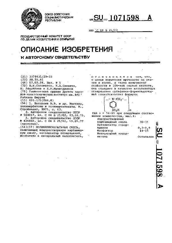 Полимерминеральная смесь / Соломатов В. И., Самигов Н. А.,Абдуллаев Ш., Муминджанов Х. И.; заявитель: Ташкентский ордена Дружбы народов политехнический институт им. Бируни А. Р. // Описания изобретений (ретрофонд) / Комитет по патентам и товарным знакам России. – М. — (Патенты России)., 2003. – 1984, № 1. — Загл. с титул. экрана. — Поисковая система: ИПС MIMOSA GTI. — Систем. требования: Acrobat Reader. — Режим доступа: ftp://smolensklib.ru/bd/patent_ru/pt1071598.pdf. — <URL:ftp://smolensklib.ru/bd/patent_ru/pt1071598.pdf>.