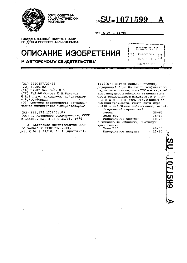 Легкий зональный гравий / Айзбеков Л. А., Баженов Ю. М., Эллерн М. А. [и др.]; заявитель: Опытное производственно-техническое предприятие "Энерготехпром" // Описания изобретений (ретрофонд) / Комитет по патентам и товарным знакам России. – М. — (Патенты России)., 2003. – 1984, № 1. — Загл. с титул. экрана. — Поисковая система: ИПС MIMOSA GTI. — Систем. требования: Acrobat Reader. — Режим доступа: ftp://smolensklib.ru/bd/patent_ru/pt1071599.pdf. — <URL:ftp://smolensklib.ru/bd/patent_ru/pt1071599.pdf>.