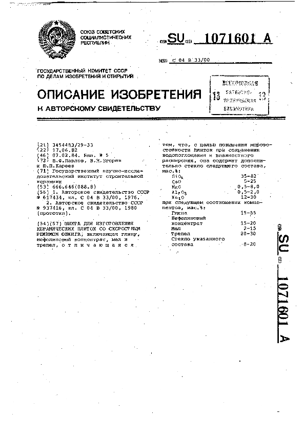 Шихта для изготовления керамических плиток со скоростным режимом обжига / Павлов В. Ф. , Егерев В. М., Кареев Ю. П.; заявитель: Государственный научно-исследовательский институт строительной керамики // Описания изобретений (ретрофонд) / Комитет по патентам и товарным знакам России. – М. — (Патенты России)., 2003. – 1984, № 1. — Загл. с титул. экрана. — Поисковая система: ИПС MIMOSA GTI. — Систем. требования: Acrobat Reader. — Режим доступа: ftp://smolensklib.ru/bd/patent_ru/pt1071601.pdf. — <URL:ftp://smolensklib.ru/bd/patent_ru/pt1071601.pdf>.