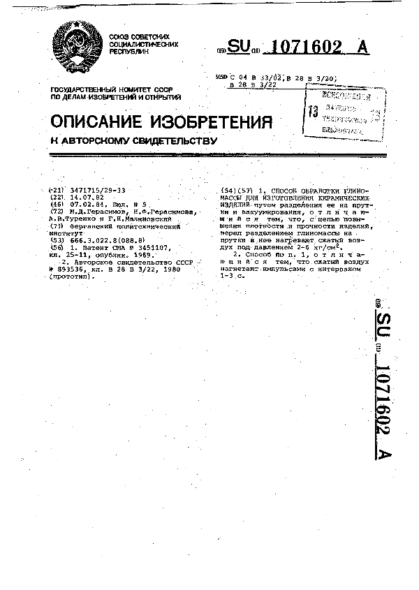 Способ обработки глиномассы для изготовления керамических изделий / Герасимов М. Д., Герасимова Н. Ф., Туренко А. В., Малиновский Г. Н.; заявитель: Ферганский политехнический институт // Описания изобретений (ретрофонд) / Комитет по патентам и товарным знакам России. – М. — (Патенты России)., 2003. – 1984, № 1. — Загл. с титул. экрана. — Поисковая система: ИПС MIMOSA GTI. — Систем. требования: Acrobat Reader. — Режим доступа: ftp://smolensklib.ru/bd/patent_ru/pt1071602.pdf. — <URL:ftp://smolensklib.ru/bd/patent_ru/pt1071602.pdf>.