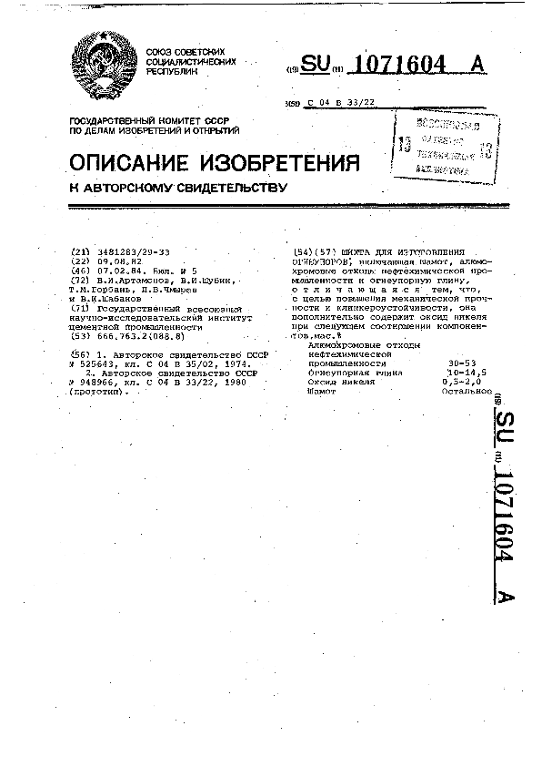 Шихта для изготовления огнеупоров / Артамонов В. И., Шубин В. И., Горбань Т. М. [и др.]; заявитель: Государственный всесоюзный научно-исследовательский институт цементной промышленности // Описания изобретений (ретрофонд) / Комитет по патентам и товарным знакам России. – М. — (Патенты России)., 2003. – 1984, № 1. — Загл. с титул. экрана. — Поисковая система: ИПС MIMOSA GTI. — Систем. требования: Acrobat Reader. — Режим доступа: ftp://smolensklib.ru/bd/patent_ru/pt1071604.pdf. — <URL:ftp://smolensklib.ru/bd/patent_ru/pt1071604.pdf>.