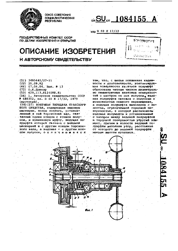 Конечная передача транспортного средства / Довнар О. К. // Описания изобретений (ретрофонд) / Комитет по патентам и товарным знакам России. – М. — (Патенты России)., 2003. – 1984, № 1. — Загл. с титул. экрана. — Поисковая система: ИПС MIMOSA GTI. — Систем. требования: Acrobat Reader. — Режим доступа: ftp://smolensklib.ru/bd/patent_ru/pt1084155.pdf. — <URL:ftp://smolensklib.ru/bd/patent_ru/pt1084155.pdf>.