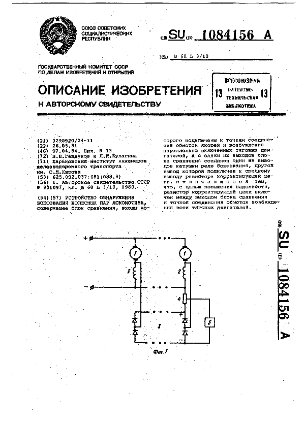 Устройство обнаружения боксования колесных пар лакомотива / Гайдуков В. Е., Кулагина Л. И.; заявитель : Харьковский институт инженеров железнодорожного транспорта им. С. М. Кирова // Описания изобретений (ретрофонд) / Комитет по патентам и товарным знакам России. – М. — (Патенты России)., 2003. – 1984, № 1. — Загл. с титул. экрана. — Поисковая система: ИПС MIMOSA GTI. — Систем. требования: Acrobat Reader. — Режим доступа: ftp://smolensklib.ru/bd/patent_ru/pt1084156.pdf. — <URL:ftp://smolensklib.ru/bd/patent_ru/pt1084156.pdf>.