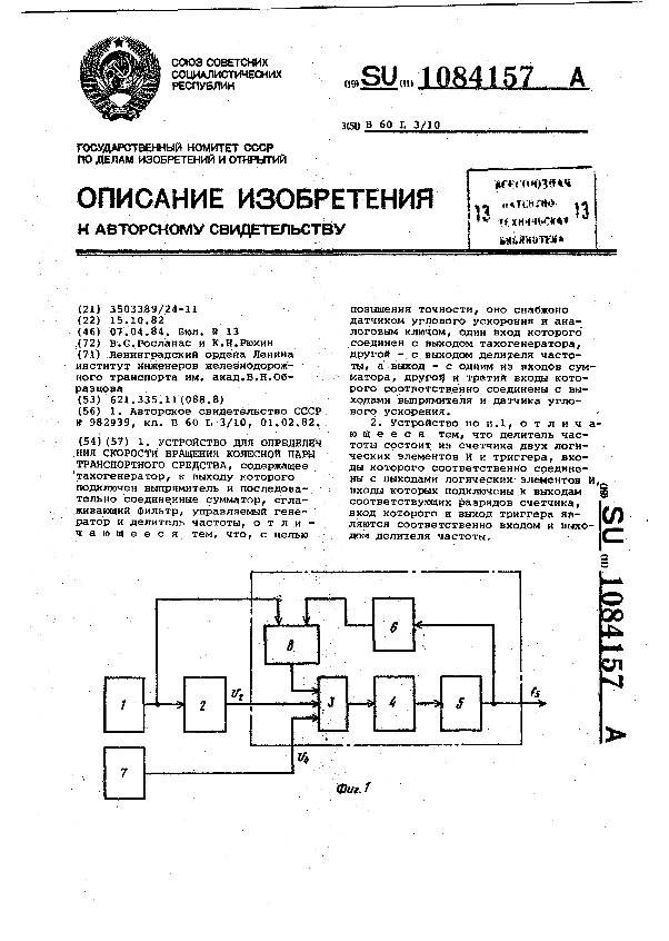 Устройство для определения скорости вращения колесной пары транспортного средства / Росланас В. С., Рюхин К. Н.; заявитель : Ленинградский ордена Ленина институт инженеров железнодорожного транспорта им. акад. В. Н. Образцова // Описания изобретений (ретрофонд) / Комитет по патентам и товарным знакам России. – М. — (Патенты России)., 2003. – 1984, № 1. — Загл. с титул. экрана. — Поисковая система: ИПС MIMOSA GTI. — Систем. требования: Acrobat Reader. — Режим доступа: ftp://smolensklib.ru/bd/patent_ru/pt1084157.pdf. — <URL:ftp://smolensklib.ru/bd/patent_ru/pt1084157.pdf>.