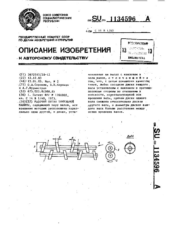 Рабочий орган тянульной машины / Сорокин О.А., Корнеев В. И., Бурмистров А.Г. // Описания изобретений (ретрофонд) / Комитет по патентам и товарным знакам России. – М., 2003. – 1985, № 1. — (Патенты России). — Загл. с титул. экрана. — Поисковая система: MIMOSA GTI. — Систем. требования: Acrobat Reader. — Режим доступа: ftp://smolensklib.ru/bd/patent_ru/pt1134596.pdf. — <URL:ftp://smolensklib.ru/bd/patent_ru/pt1134596.pdf>.