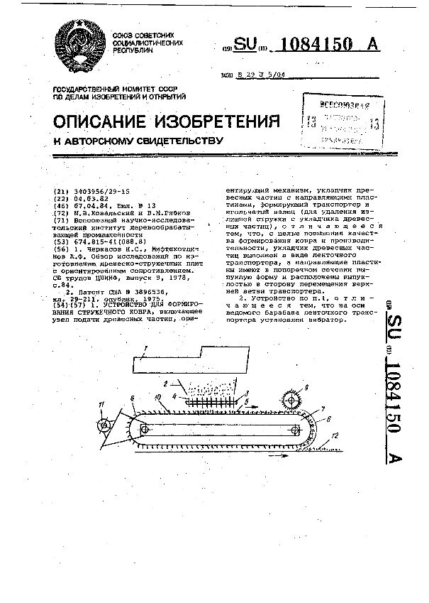 Устройство для формирования стружечного ковра / Ковальский М. В., Рябков В. М.; заявитель : Всесоюзный научно-исследовательский институт деревообрабатывающей промышленности // Описания изобретений (ретрофонд) / Комитет по патентам и товарным знакам России. – М. — (Патенты России)., 2003. – 1984, № 1. — Загл. с титул. экрана. — Поисковая система: ИПС MIMOSA GTI. — Систем. требования: Acrobat Reader. — Режим доступа: ftp://smolensklib.ru/bd/patent_ru/pt1084150.pdf. — <URL:ftp://smolensklib.ru/bd/patent_ru/pt1084150.pdf>.