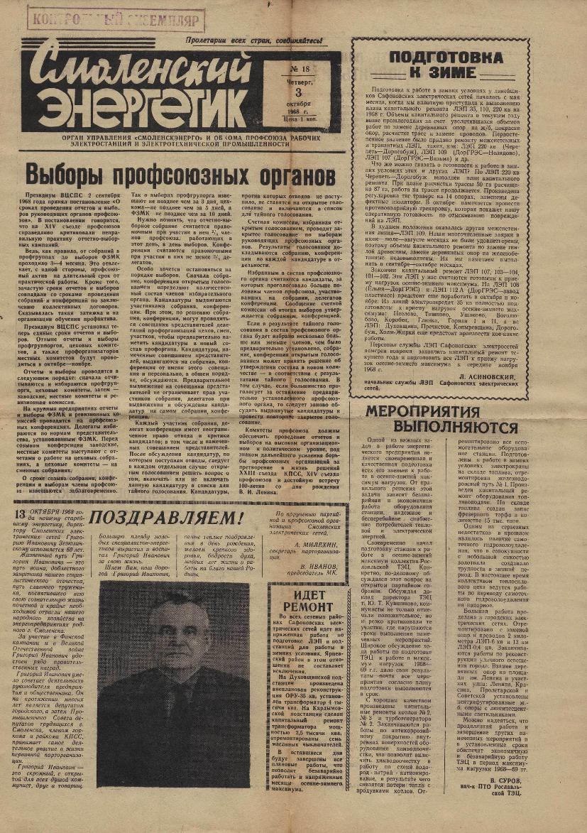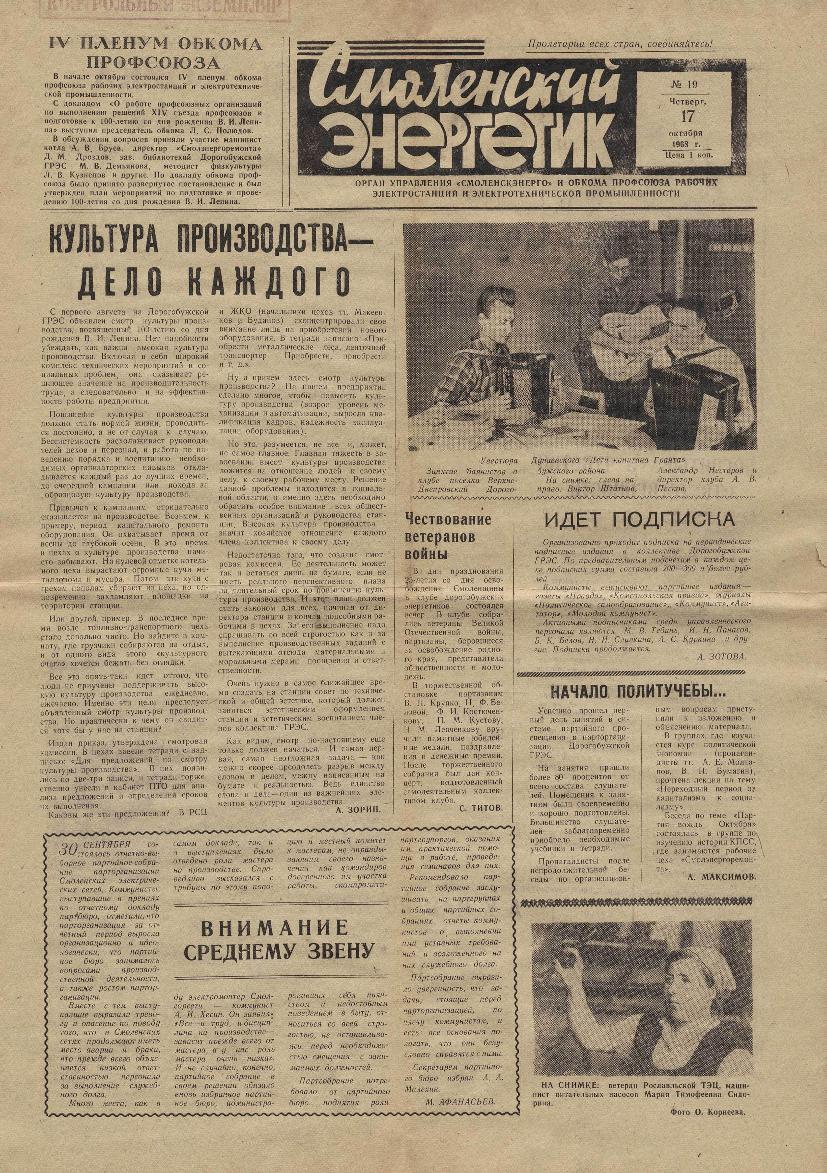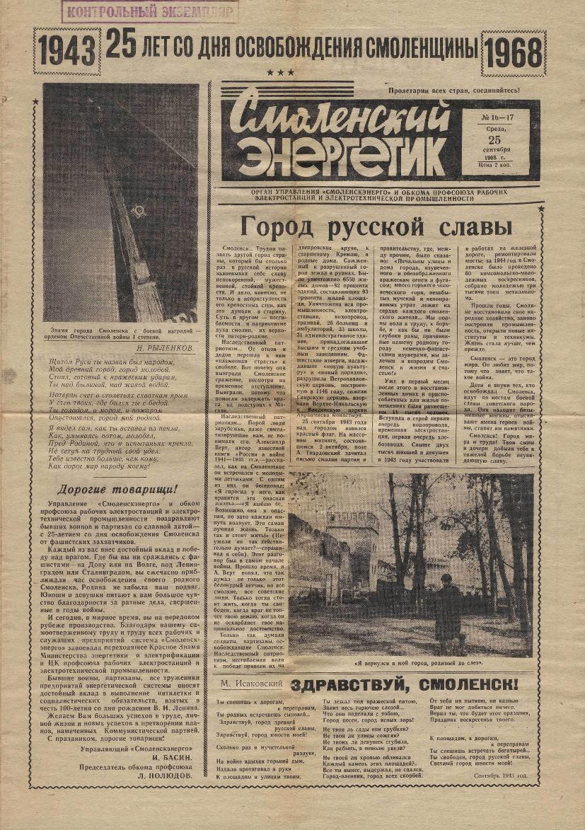 Смоленский энергетик: Орган управления "Смоленскэнерго" и обкома Союза работников электростанции и электротехнической промышленности. — Смоленск: Смолгортип., 1968-____. № 19.