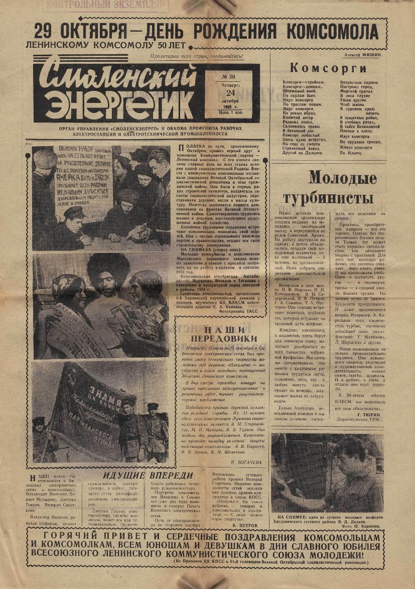 Смоленский энергетик: Орган управления "Смоленскэнерго" и обкома Союза работников электростанции и электротехнической промышленности. — Смоленск: Смолгортип., 1968-____. № 20.
