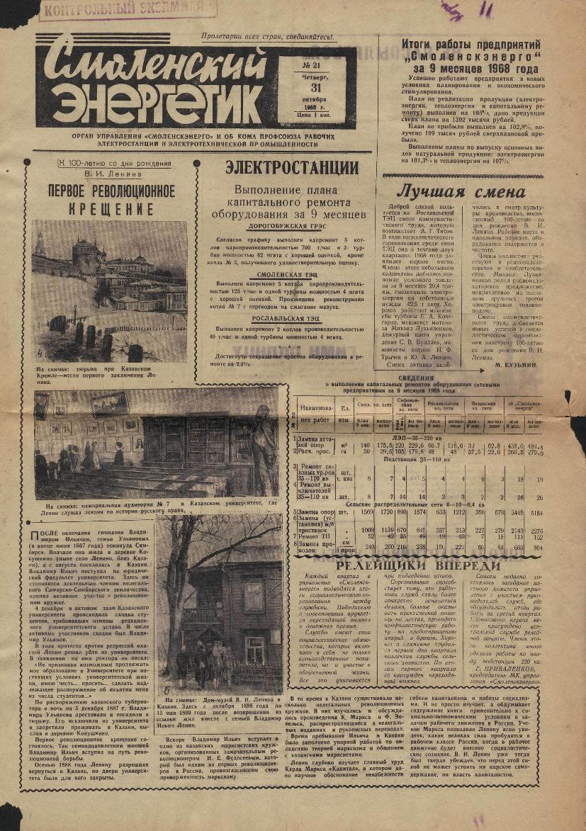 Смоленский энергетик: Орган управления "Смоленскэнерго" и обкома Союза работников электростанции и электротехнической промышленности. — Смоленск: Смолгортип., 1968-____. № 21.